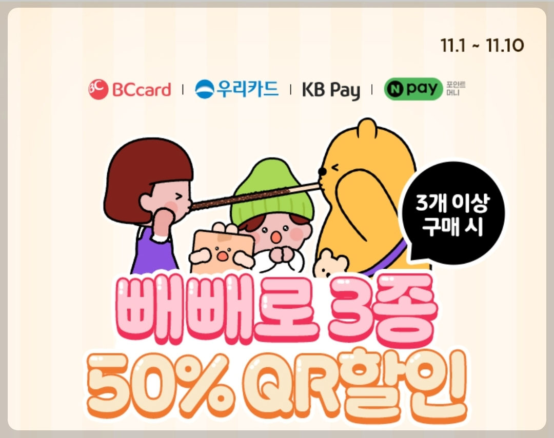 미리미리 준비해서 50% 할인 받고, 11월11일 빼빼로 데이를 즐기 시길 바랍니다.