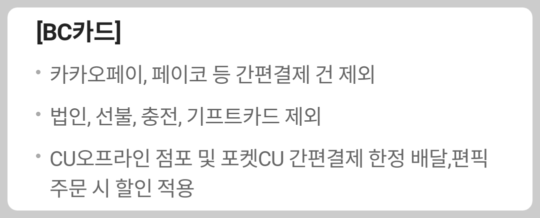BC카드로 결제시 카카오페이, 페이코 등의 간편결제는 할인을 받을 수 없습니다.