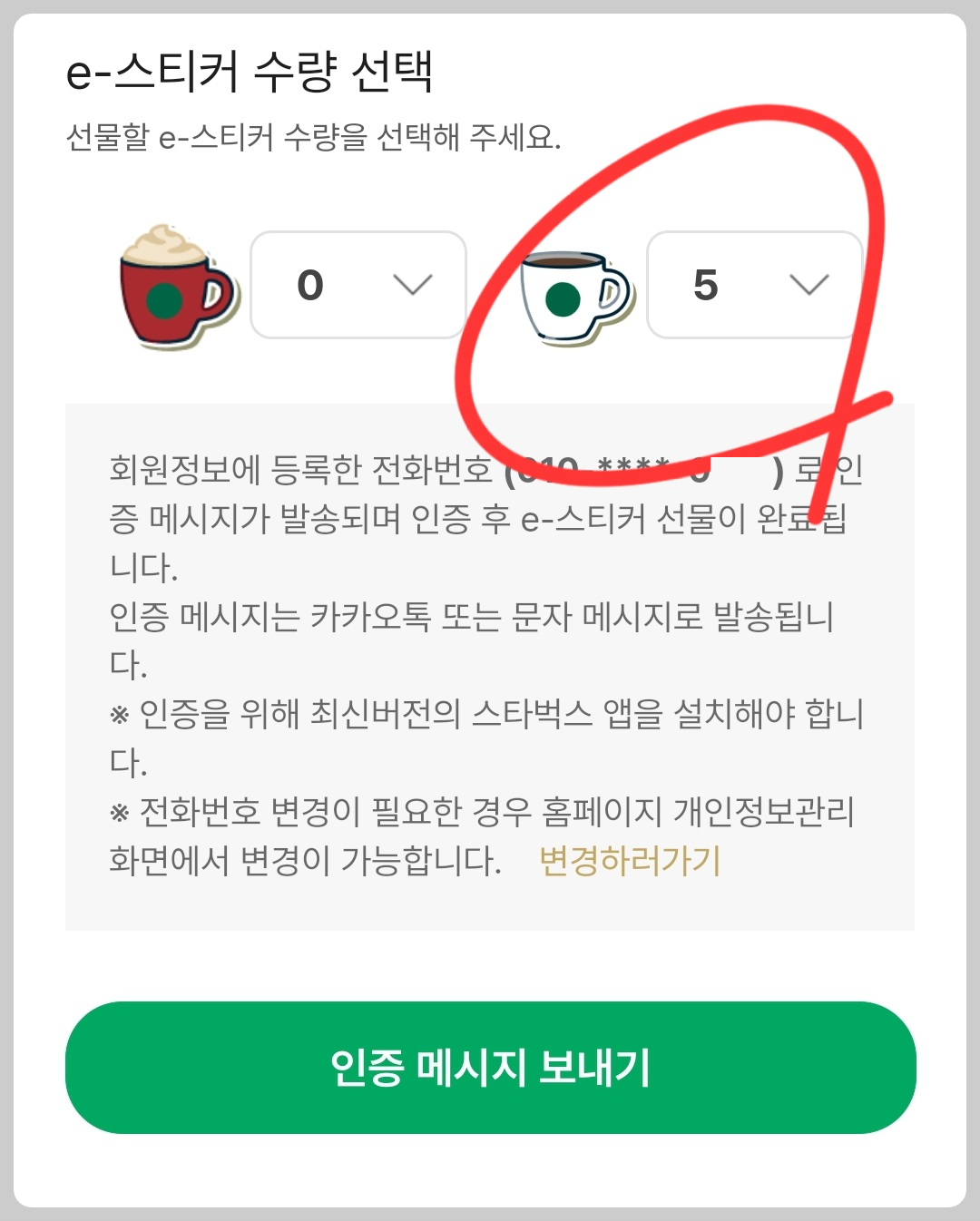 내가 가지고 있는 스타벅스 프리퀀시 스티커 갯수가 표시가 되면, 선물하려는 갯수만큼 선택을 하면 됩니다.