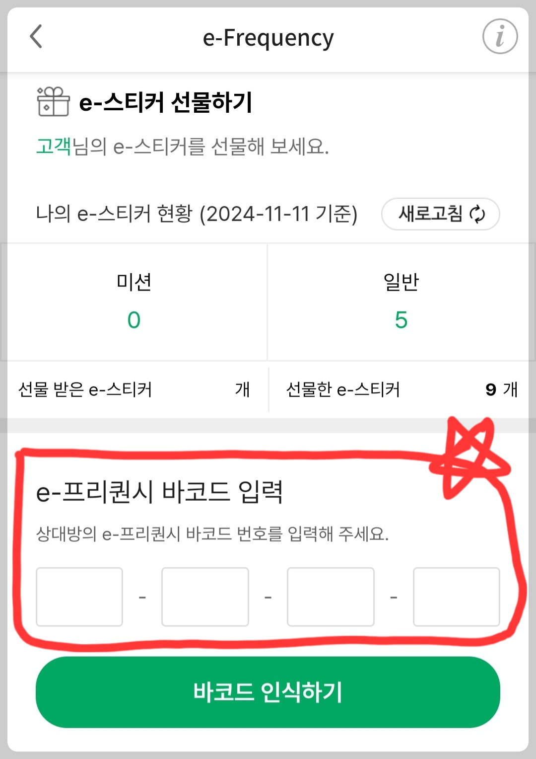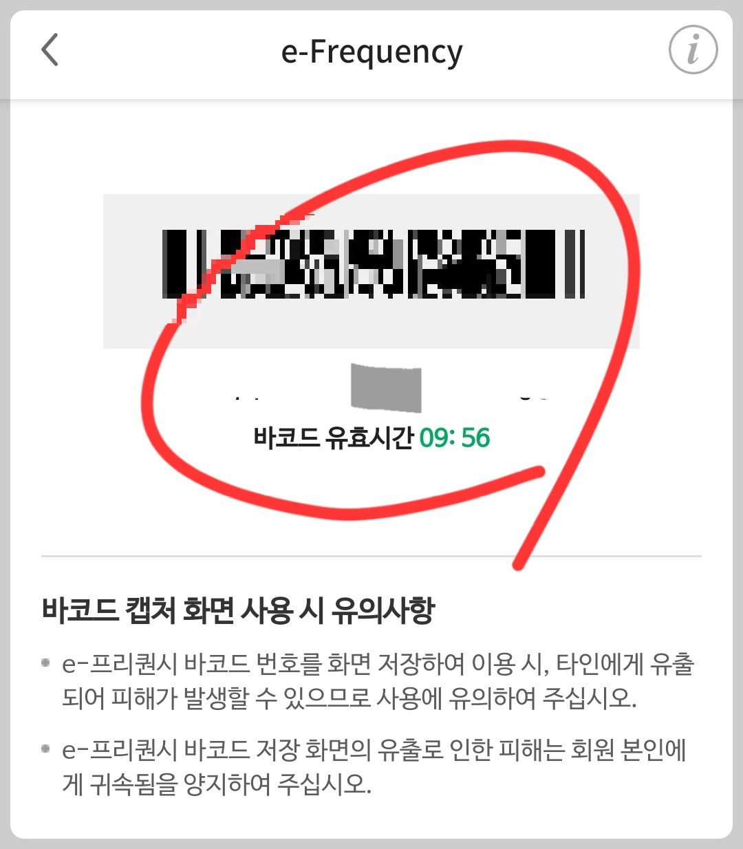 프리퀀시 바코드 번호는 유효시간(10분)이 있으므로, 선물하려고 할 때 물어보는 것이 좋습니다.