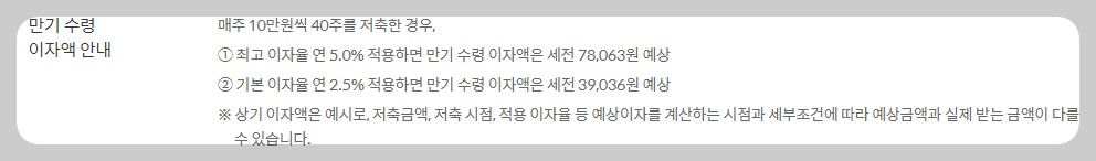 그리고 예를 들어 매주 10만원씩 40주를 저축했을 때의 만기 수령이자에 대해서 알아보겠습니다.