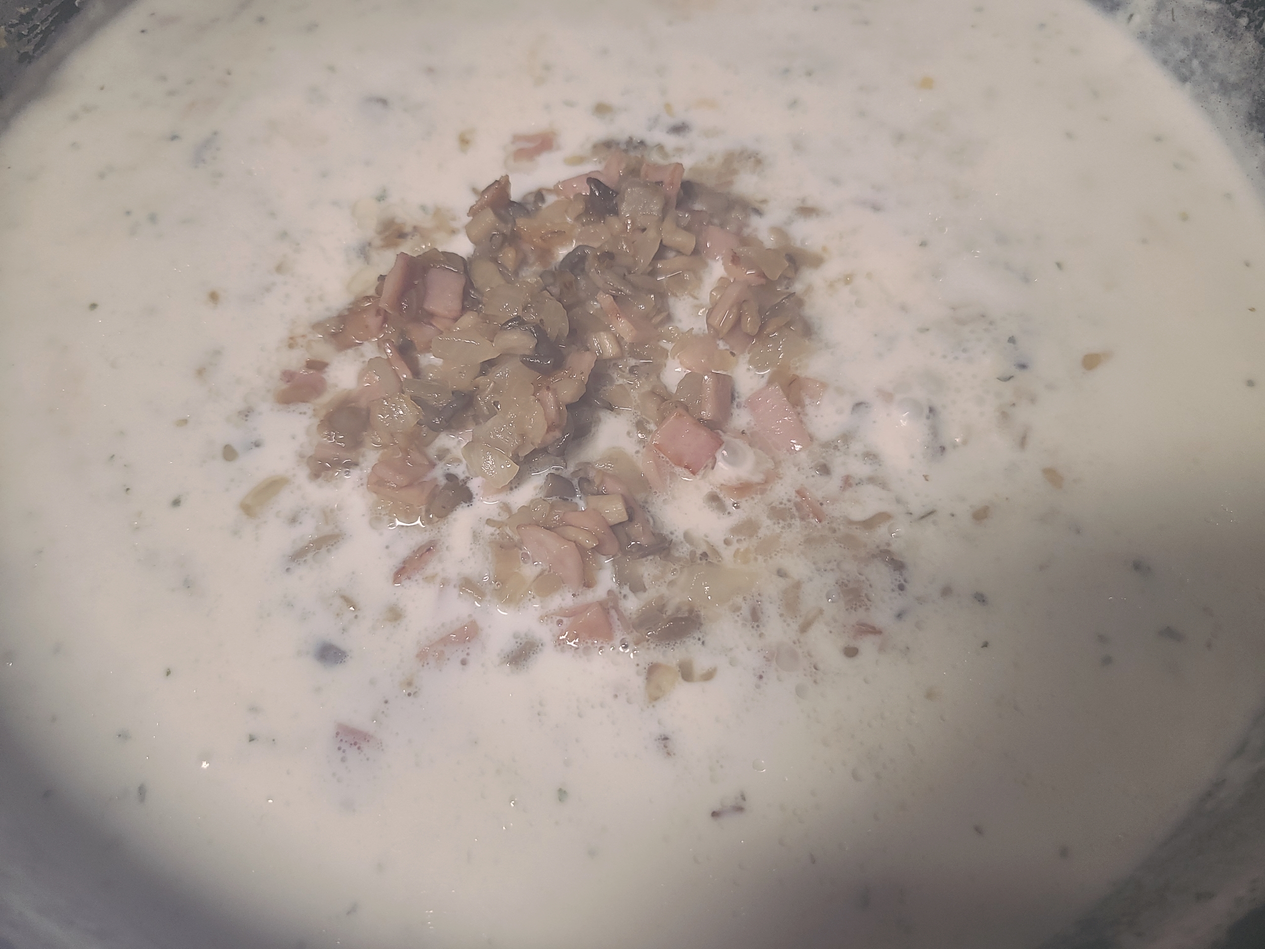 그리고 볶아둔 양파+햄+버섯을 넣어주고 끓여 주었다.