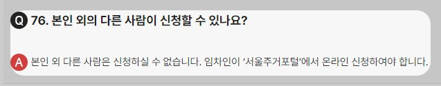 본인 외 다른 사람은 신청 할 수 없으며, 임차인이 '서울주거포털'에서 온라인으로 신청하여야 합니다.