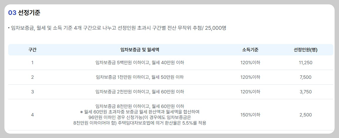 - 임차보증금 및 월세, 소득기준 4개 구간으로 나누어 선정합니다.(총 인원 25,000명)