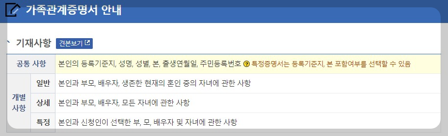 - 특정: 본인과 신청인이 선택한 부,모,배우자 및 자녀에 관한 사항