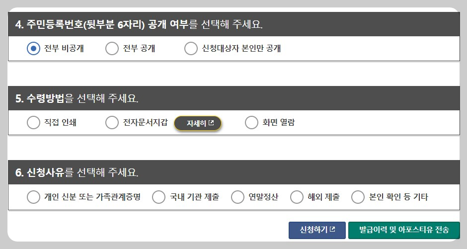 직접 인쇄를 선택하고, 신청사유에서는 국내 기관 제출로 체크하고 신청하기를 누르면 됩니다.